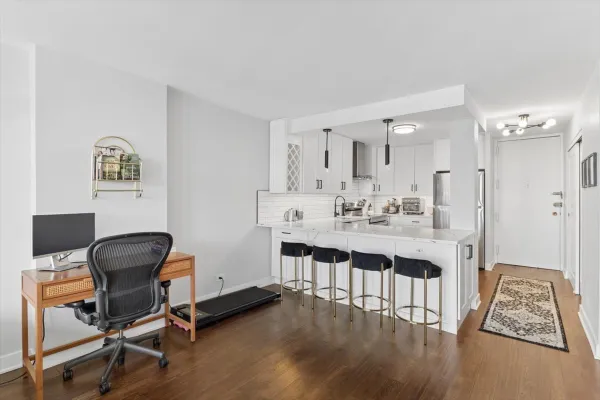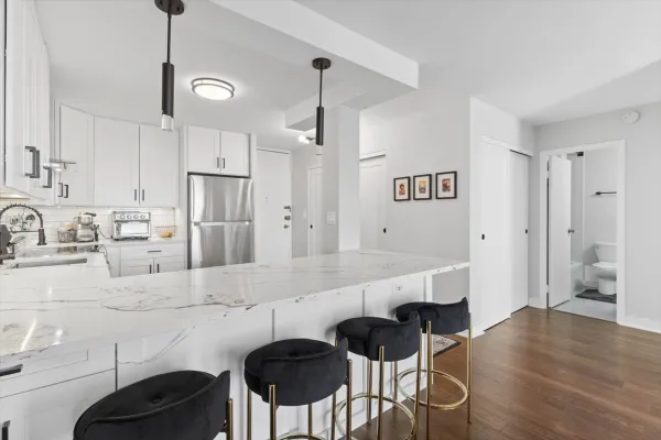 Welcome to this beautifully renovated one-bedroom, one-bath condominium at Americana Towers, ideally situated in the heart of Old Town. Thoughtfully redesigned, this residence features custom white shaker cabinetry with soft-close drawers, quartz countertops, engineered hardwood flooring, and brand-new Samsung stainless steel appliances. A dramatic wall of windows fills the home with natural light and provides ample space for a comfortable work-from-home setup. The spacious bedroom offers a full wall of closets, while the updated bath showcases Kohler fixtures and refined finishes throughout. Monthly assessments include heat, air conditioning, water, door staff, cable/TV, internet access, exterior maintenance, and access to exercise facilities-delivering exceptional value. This well-managed building offers outstanding amenities, including an outdoor pool, sundeck, party room, 24-hour door staff, fitness center, sauna, on-site rental parking, dry cleaning services, and valet guest parking. With no rental restrictions and pet-friendly policies (30 lb. limit), flexibility and convenience are unmatched.Enjoy immediate access to the lakefront and Lincoln Park, as well as proximity to the shops and dining of Magnificent Mile. Commuting is effortless with the Clark/Division station and nearby CTA bus routes just steps away. This is city living at its finest.